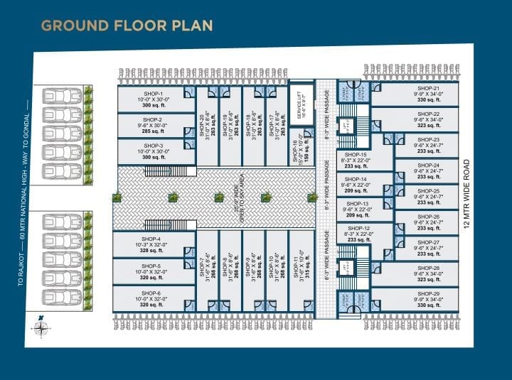 Sahajanand Prime emphasizes safety, convenience, and quality construction. Facilities such as organized parking, CCTV surveillance provisions, standard vitrified flooring, and high-quality electrical wiring enhance long-term usability and value. The availability of different unit sizes across multiple floors allows flexibility for small retailers as well as larger premium businesses.
